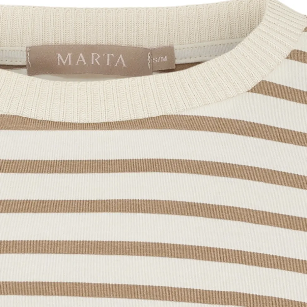 Basic og komfortabel stribet t-shirt fra Marta Du Château. Den har rund hals med ribkant og 3/4 lange ærmer. Ideel til hverdag med et par enten jeans, bukser eller nederdel.
