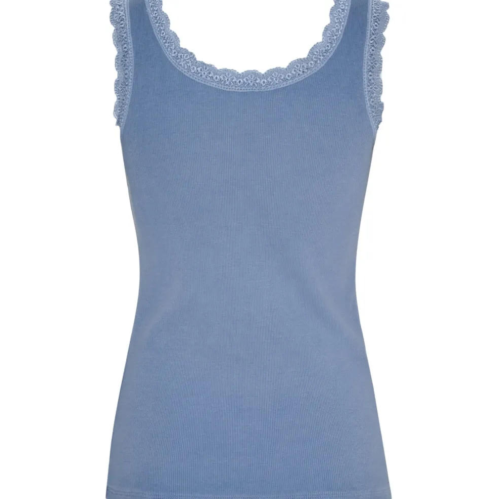 Feminin tanktop med fine blondedetaljer langs halsudskæringen og ærmegaberne. Fungerer som basislag eller til at style alene på varme dage.
