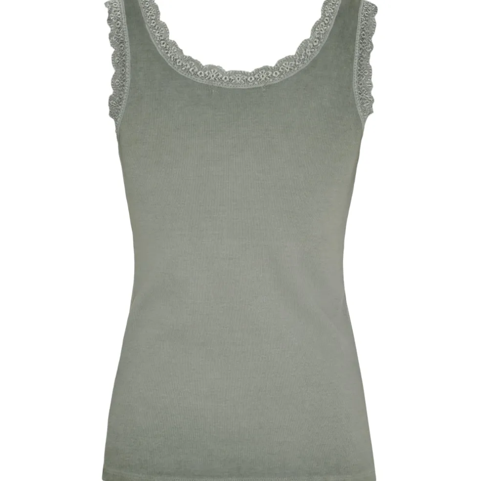 Feminin tanktop med fine blondedetaljer langs halsudskæringen og ærmegaberne. Fungerer som basislag eller til at style alene på varme dage.