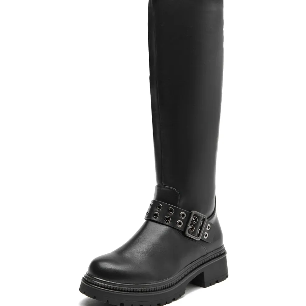 Super smarte støvler i imiteret læder. Støvlen har en justerbar spænde-detalje, samt lynlås på indersiden. Perfekte til at style med både jeans og nederdel for et sofistikeret look.