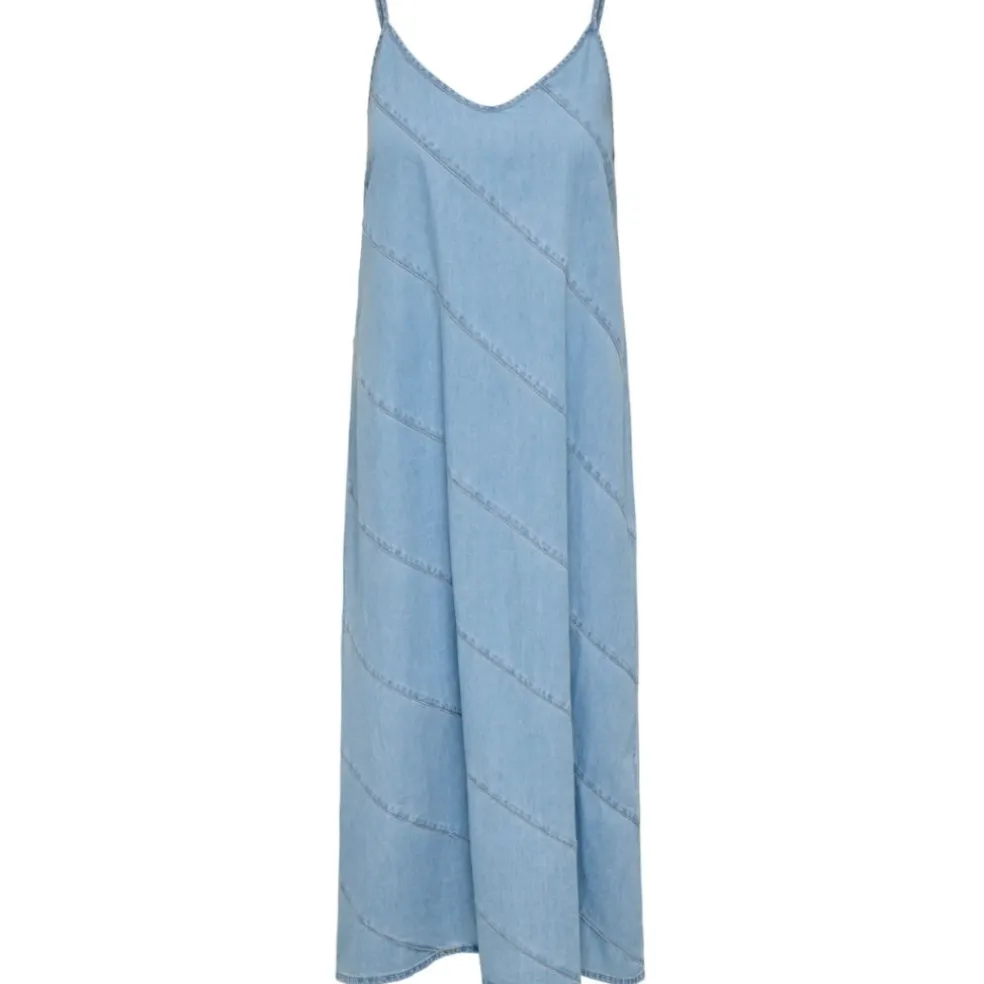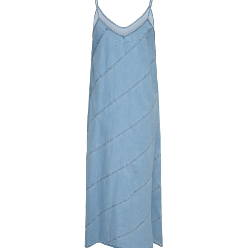 Smuk kjole fra Only i denimlook. Style til hverdagen med et par sandaler og basis cardigan. Eller style med et par stiletter og blazer til sommerens fester.