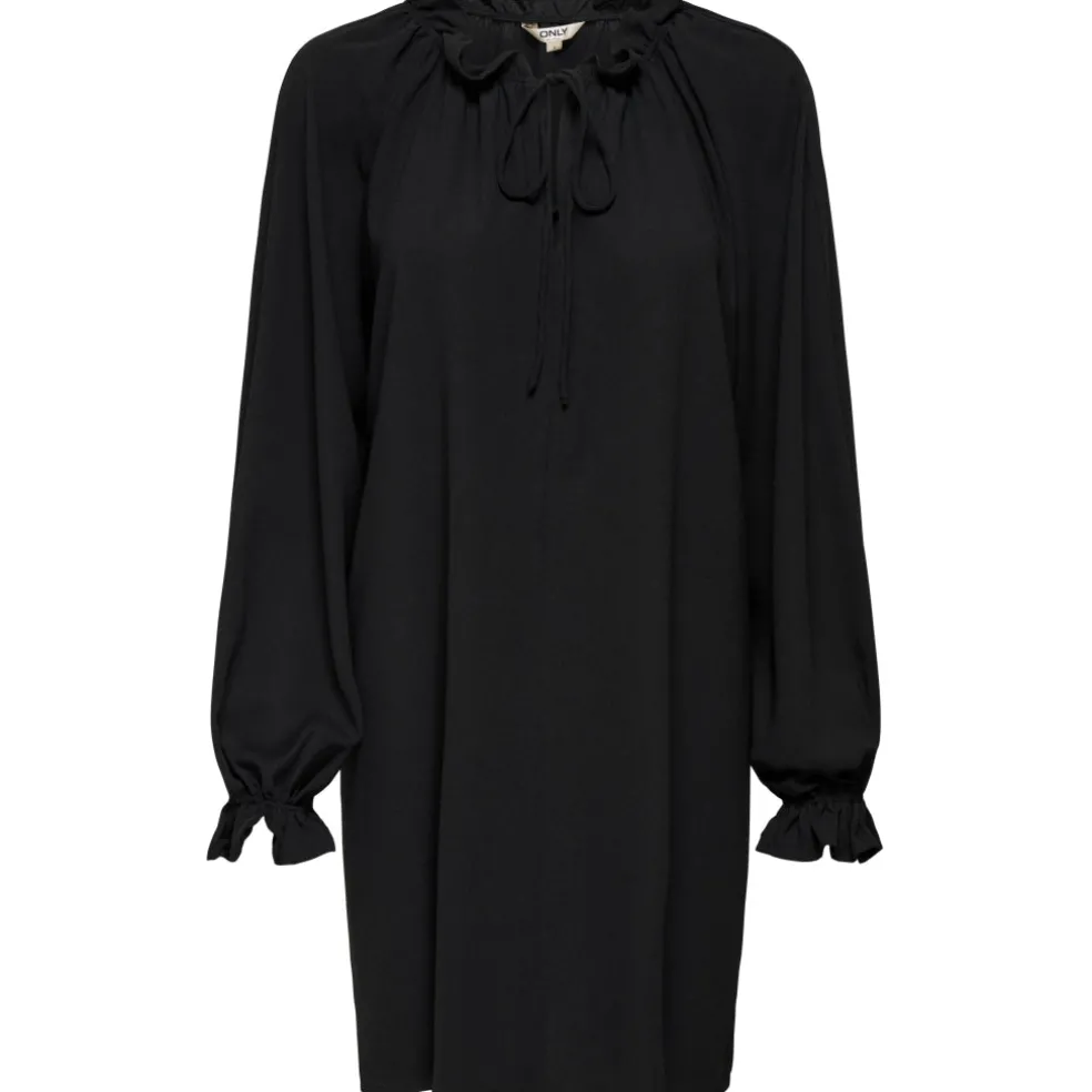 Kortærmet kjole med løs pasform og dekorative detaljer som sløjfe og flæser. Perfekt til afslappede lejligheder med lange ærmer og elastiske manchetter.