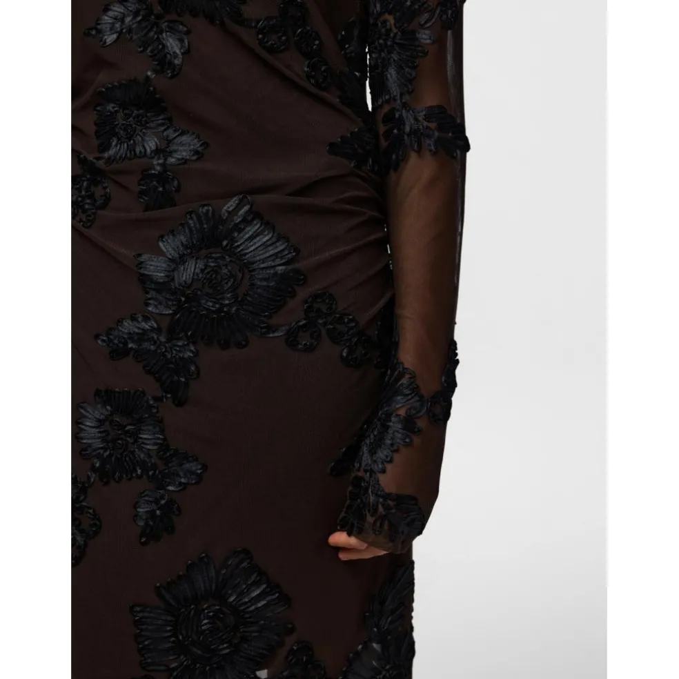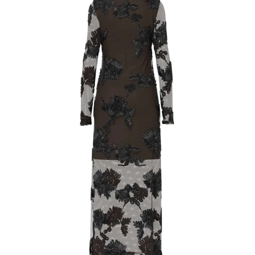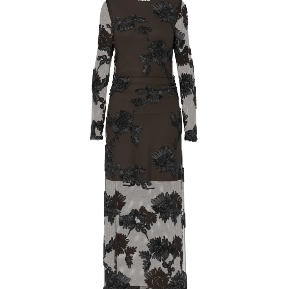 En ankellang kjole med rund hals og tætsiddende pasform. Kjolen har lange, smalle ærmer og meshdetaljer, der giver et stilfuldt udtryk.