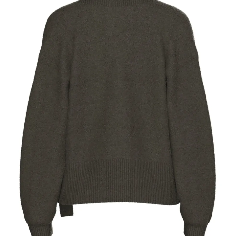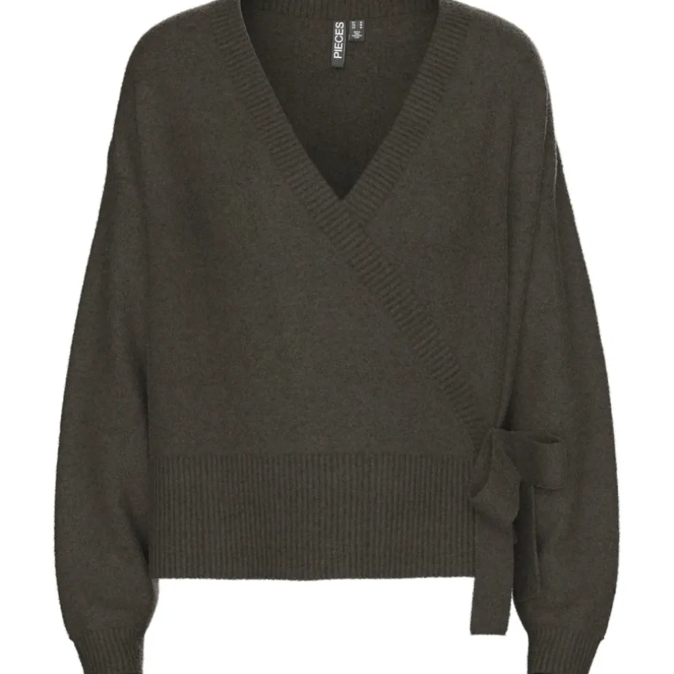 Smuk strikbluse med slå om effekt og bindebånd i siden.