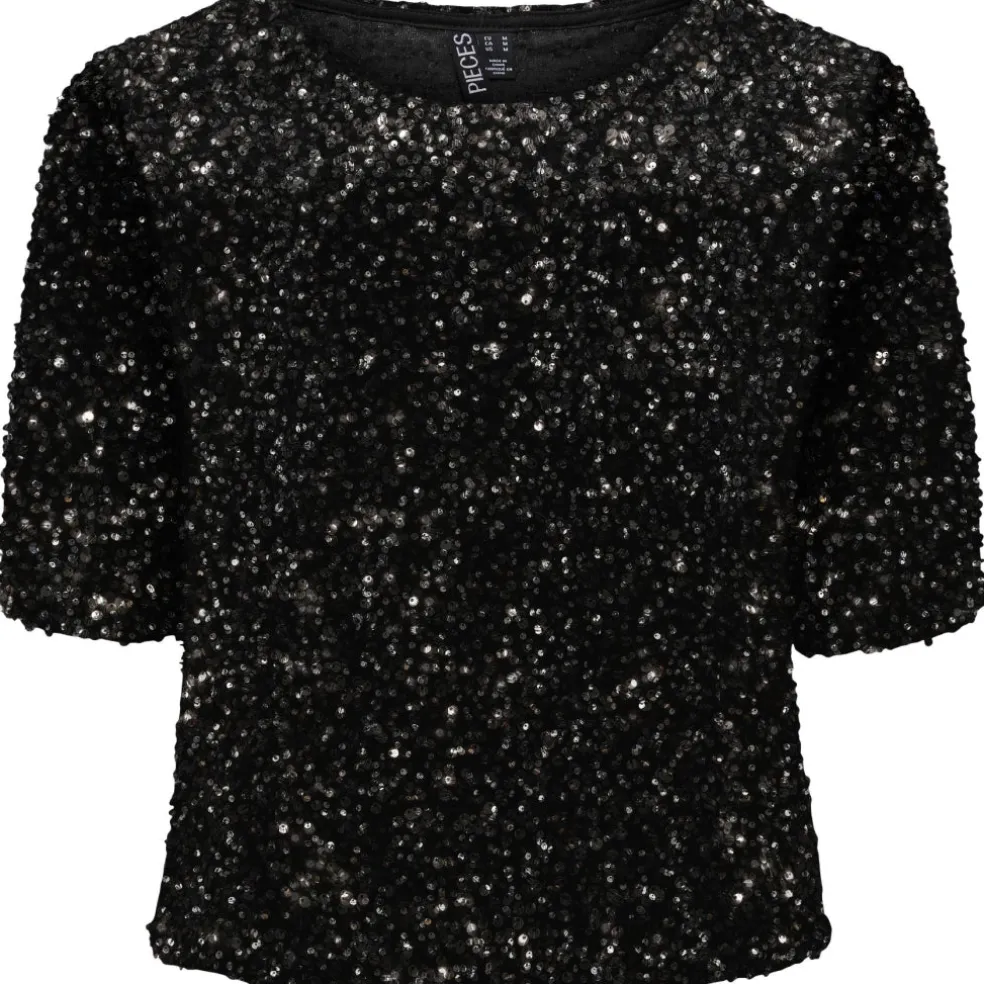 Feminin top fra Pieces med glitter og korte ærmer. Kan styles med matchende glimmerbukser fra samme serie for et komplet glitterlook.