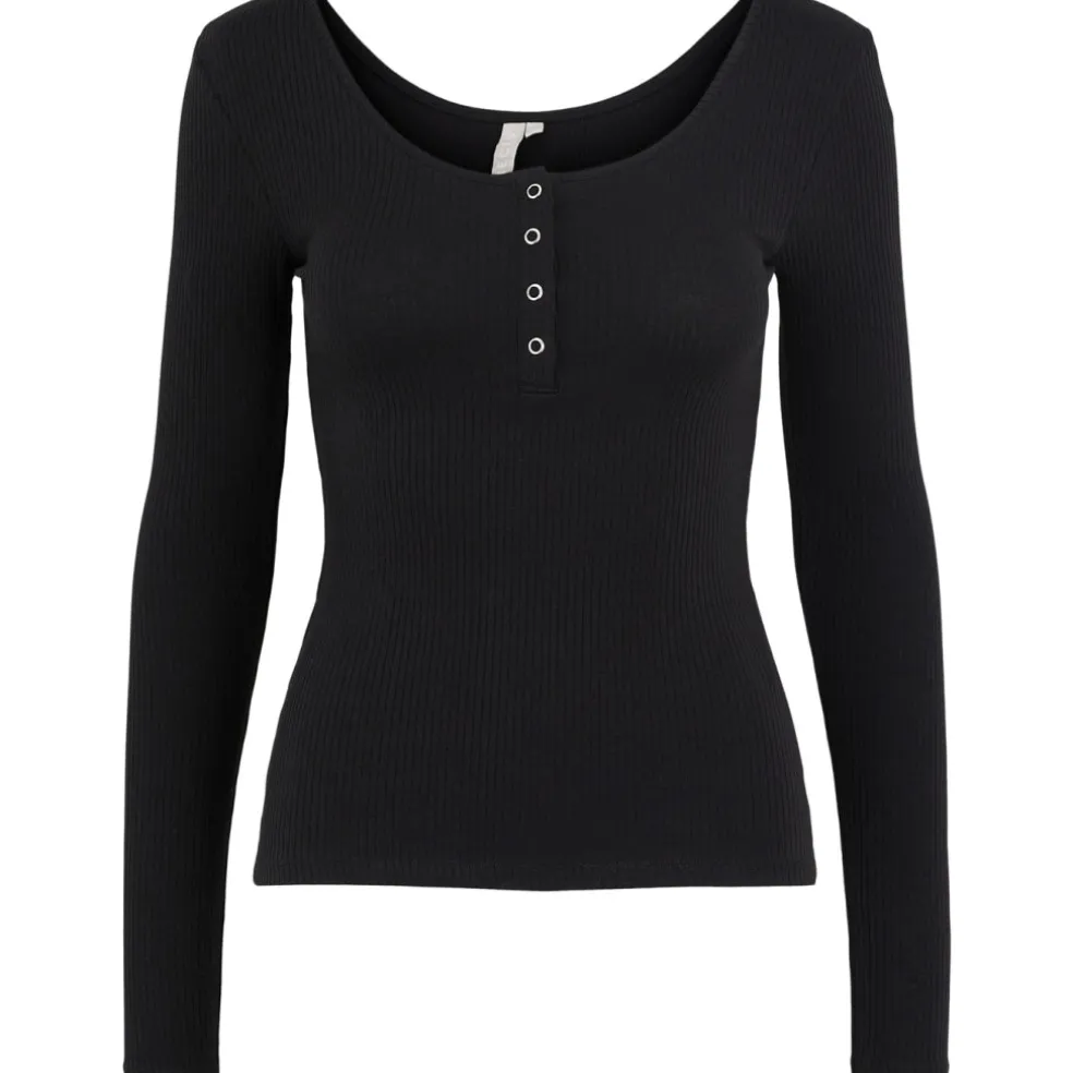 Flot langærmet bluse fra PIECES. Blusen er lavet i rib kvalitet og har trykknapper foran.