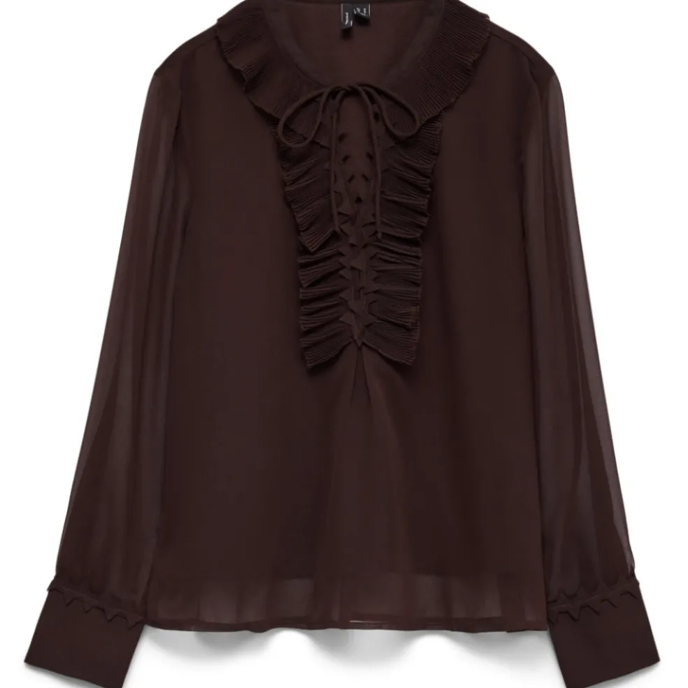 Super fin bluse fra Vero Moda med flotte flæse- og bindedetaljer foran. Denne bluse er et alsidig stykke tøj i garderoben – de kan bæres med næsten alt fra jeans, bukser eller nederdele.