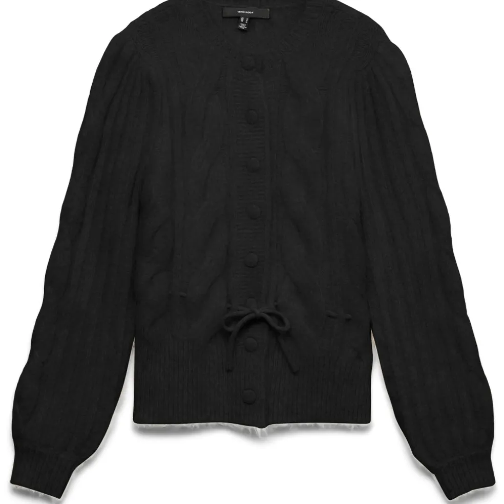 En strikket cardigan med rund hals og ribbede manchetter, der giver et elegant og komfortabelt lag til dit efterårsoutfit. Perfekt til både afslappede og mere formelle looks.