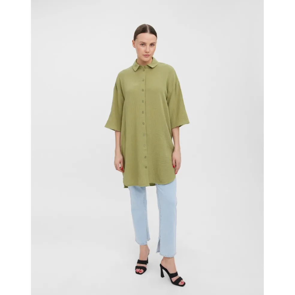 Skjorte med knapper og brede ærmer. Style denne fede skjorte med et par lange støvler og en cool taske for et smart sommer look.