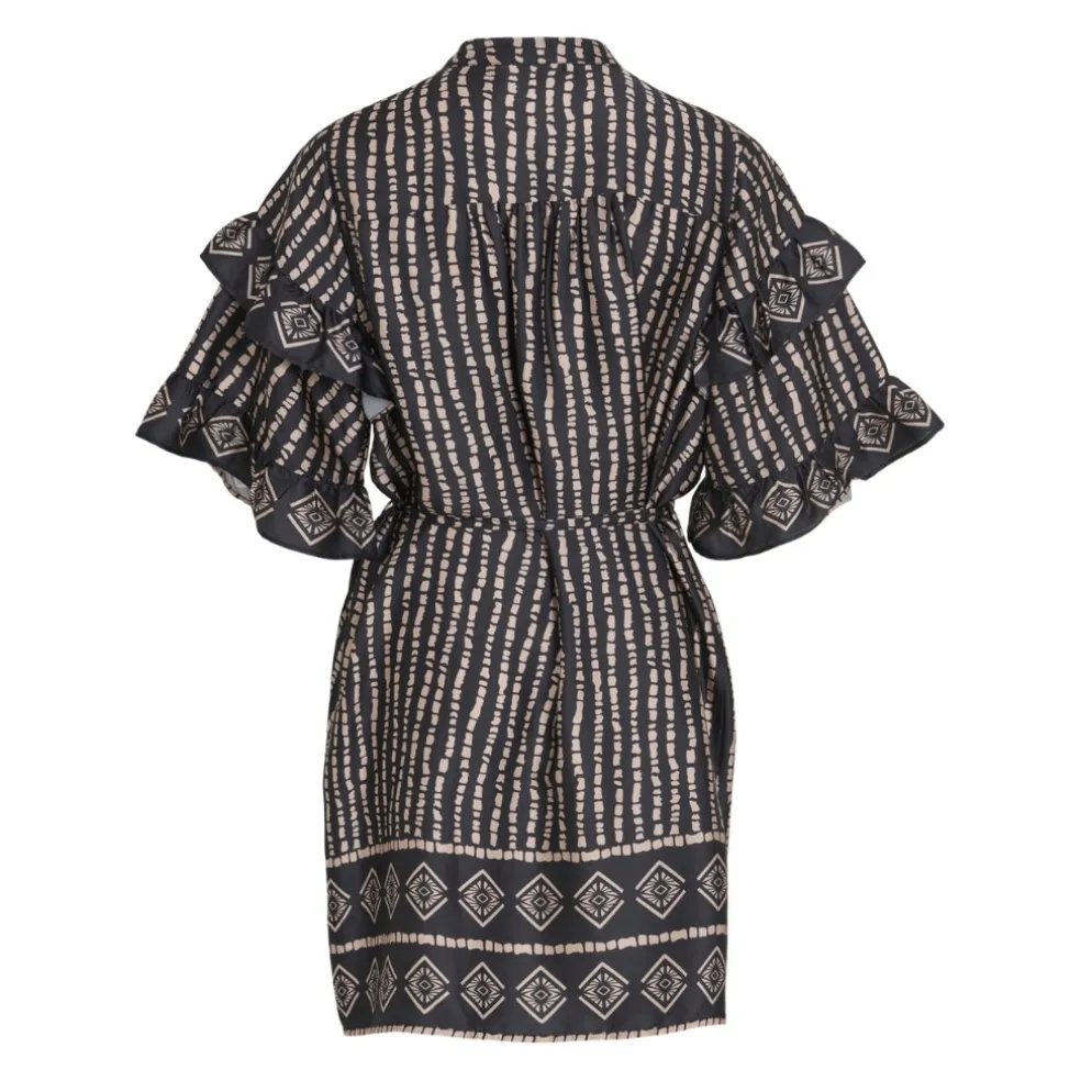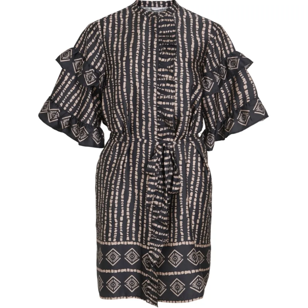 Smuk kjole fra Vila i det fineste mønster. Den har flæser på ærmerne og front, samt bindebånd i taljen. Kjolen kan bruges både til hverdag og finere brug.