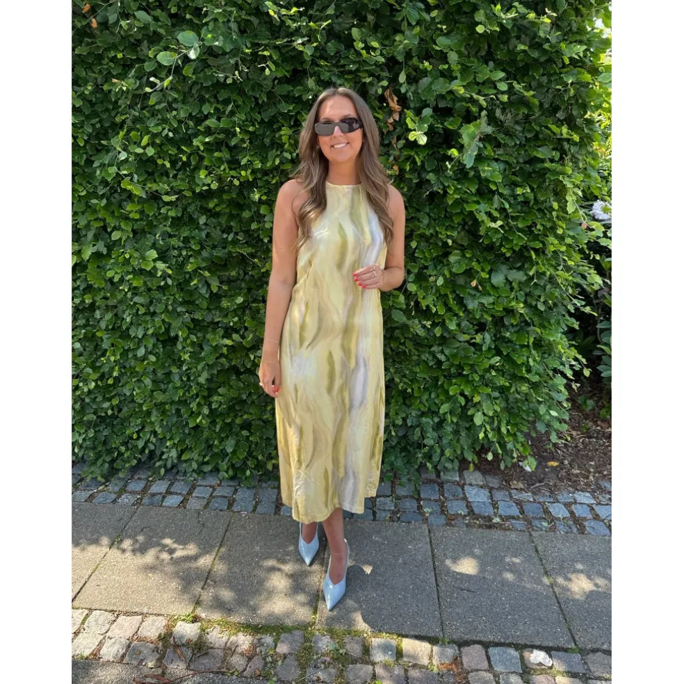 Den smukkeste gule kjole fra Vila. Høj, rund hals og falder flot. Style den til sommerens fest med et par stiletter eller ballerinaer.