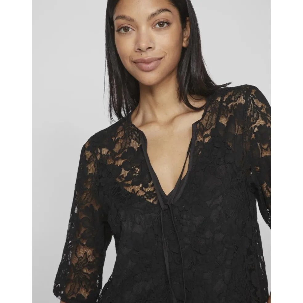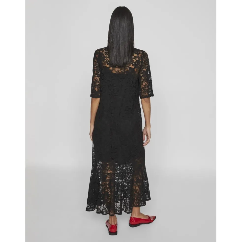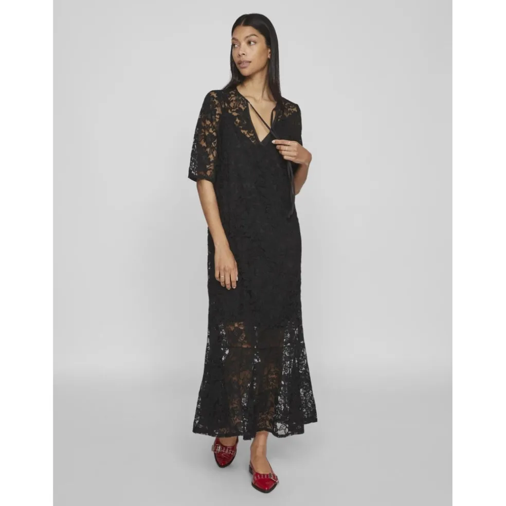 Den smukkeste blondekjole der går lidt ud forneden og har bindebånd ved halsen. Den har en kort underkjole.