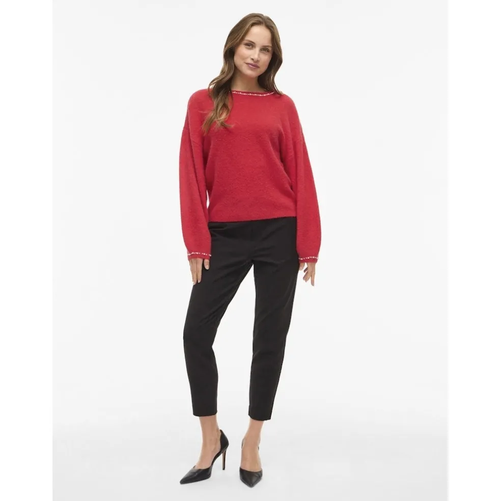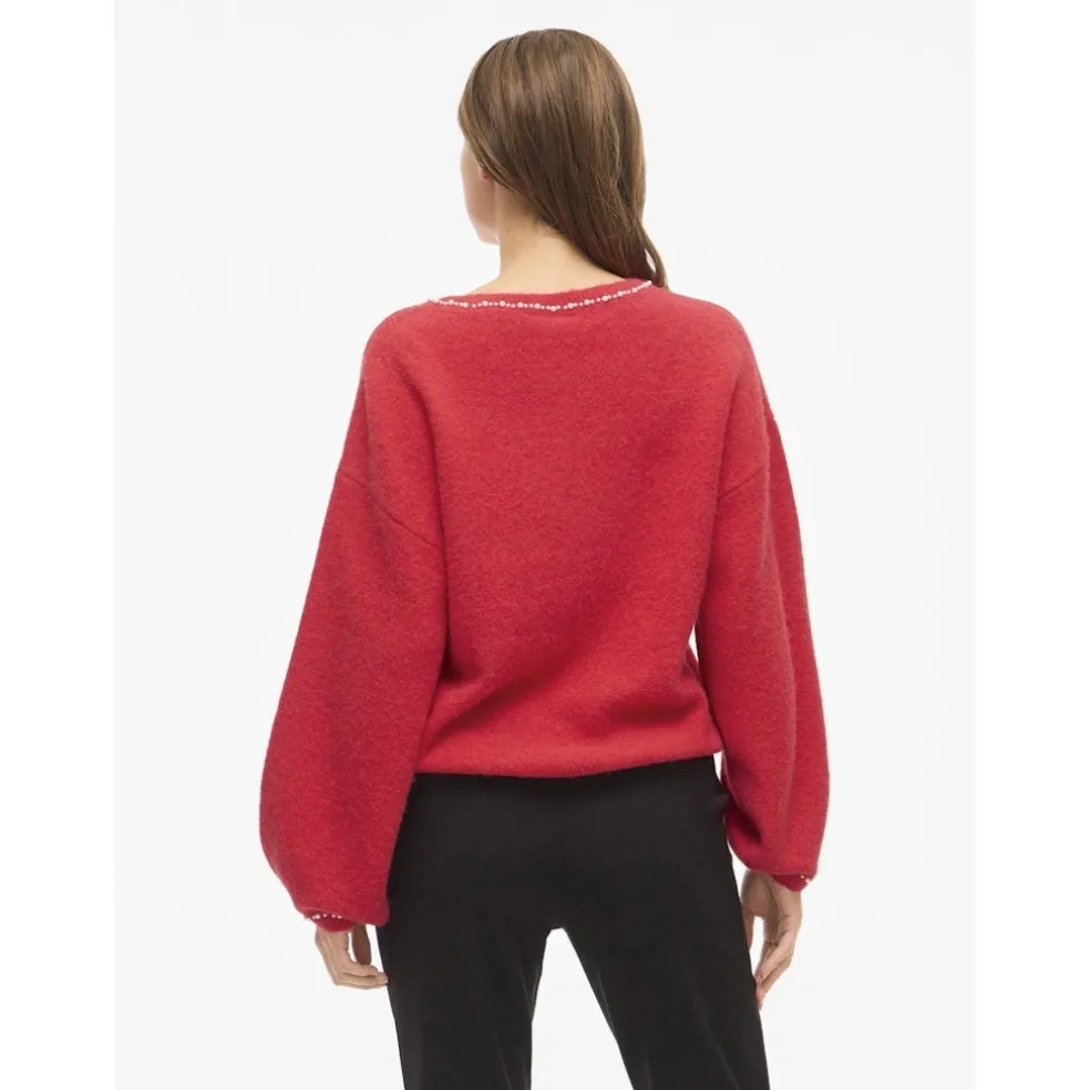 Smuk striktrøje fra Vila med fint perlebroderi. Striktrøjen har en normal pasform med løse ærmer. Denne strik er helt perfekt til de kolde vinterdage.