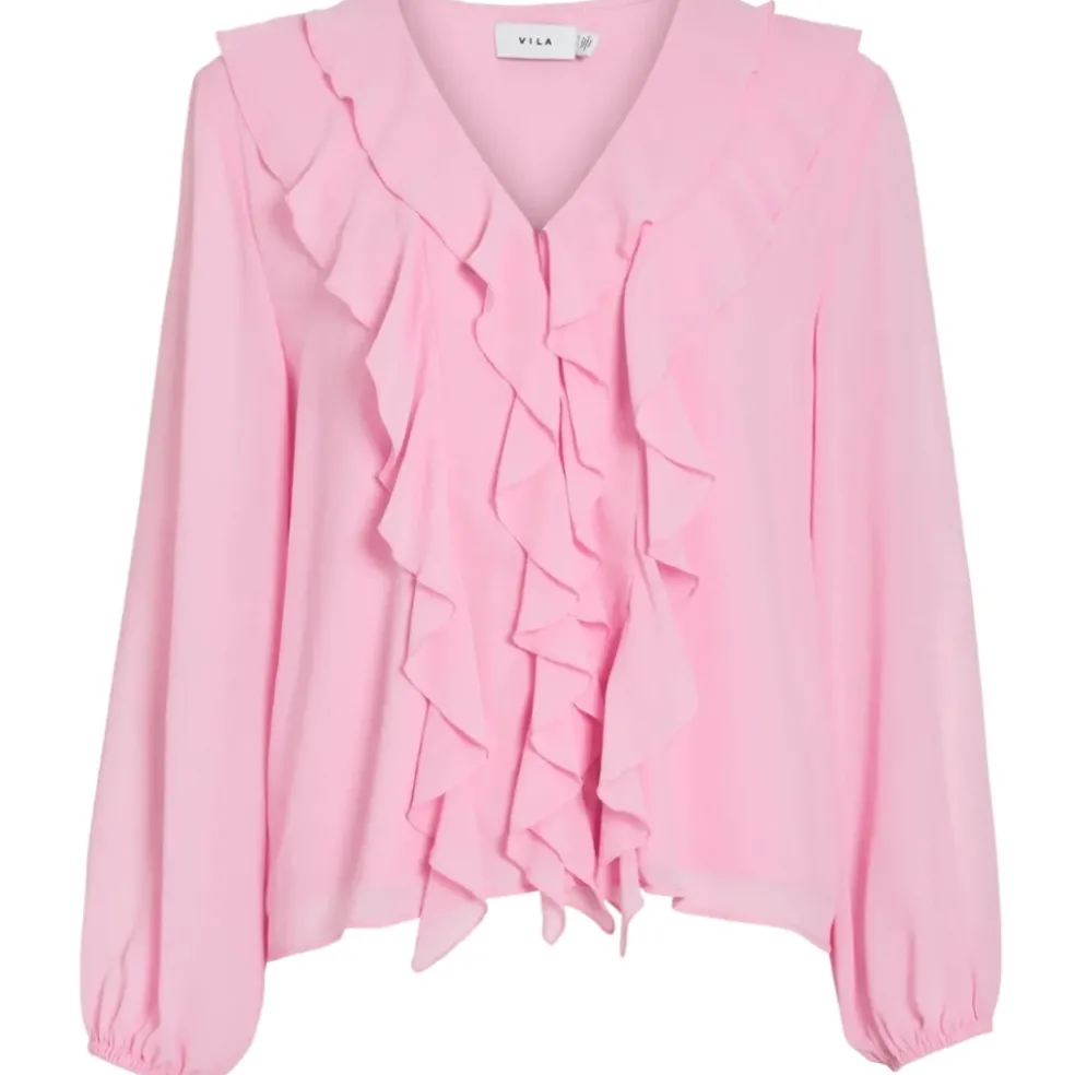 Smuk bluse fra Vila, med flæser og v-hals. Style med et par jeans eller habitbukser.