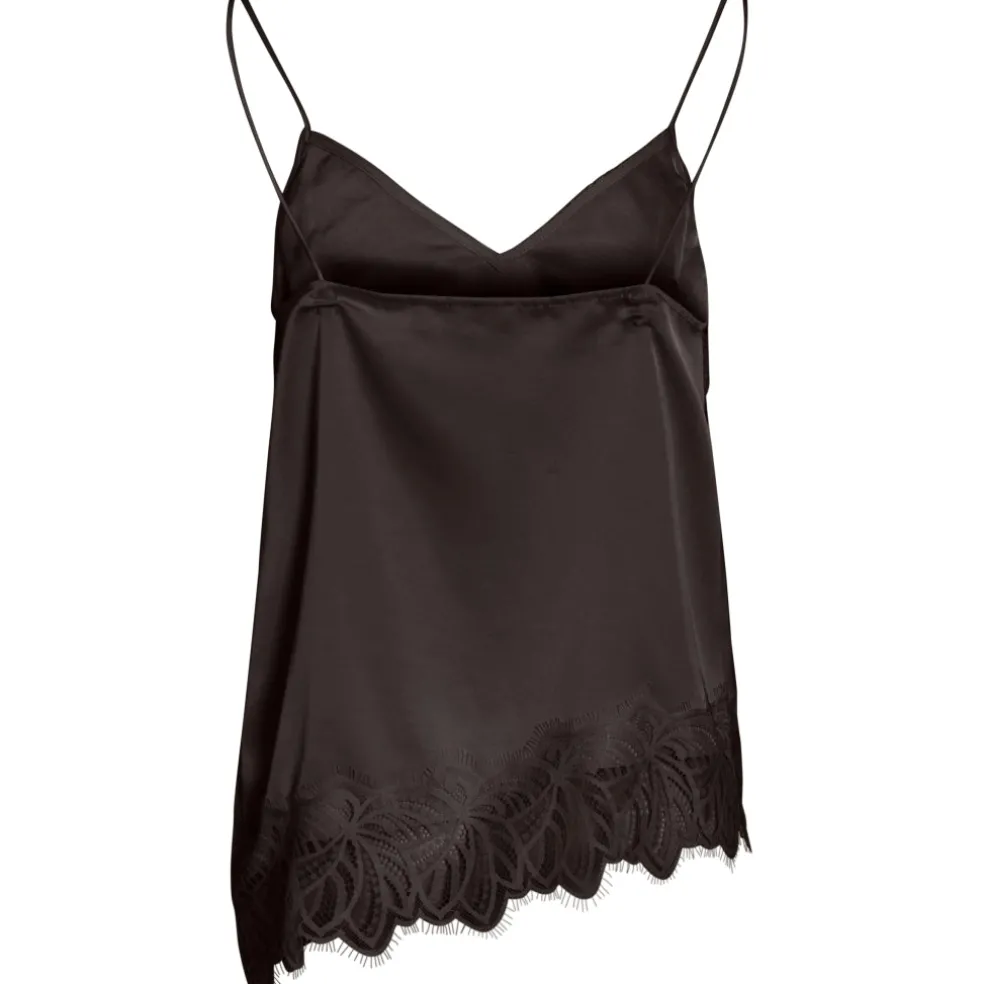 Let og elegant top med v-hals og ærmeløs model i satin, der sikrer en glat overflade. Regular fit og blondedetalje gør den velegnet til både hverdag og fest.