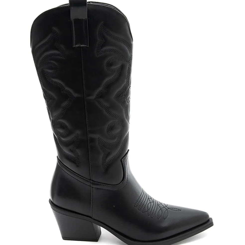 Super sej imiteret læder cowboystøvle med de fedeste detaljer. Støvlerne har en høj skaft, blokhæl og lynlås på indersiden. De kan styles til enhver lejlighed – brug den med en kjole og strømpebukser eller til et par jeans og blazer.